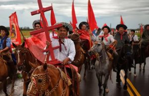 Today, Gauchito Gil is considered a folk saint. Roadside shrines can be found in his honor, denoted by red flags bearing embroidered messages of thanks. Gil’s mortal remains can purportedly be found at the Sanctuary of Gauchito Gil, a few kilometers outside Mercedes in Corrientes. Great pilgrimages to the sanctuary, 200,000 strong, are organized regularly to ask the outlaw saint for favors. Gauchito Gil’s death- and feast day, January 8th, is marked by celebration, dance, drinking, and effigy, where Gil’s likeness stands beside other figures of folk Catholicism such as San La Muerte.