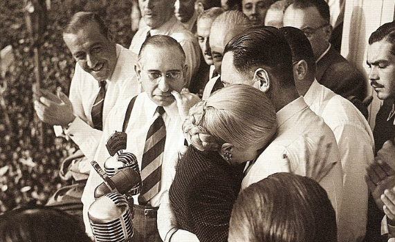 Eva Perón embraces her husband Juan on August 22nd, 1951, overlooking the Plaza de Mayo.